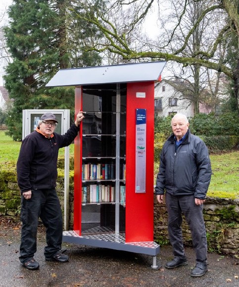 In der Nacht vom 28. auf den 29. April 2023 wurde unser Bücherschrank im Park mutwillig in Brand gesetzt. Nun gibt es einen neuen Bücherschrank ander Stelle, wo früher mal die Telefonzelle am Park stand. Der Vorsitzende des Heimatvereins Heiligenkirchen Gerd Engstfeld (rechts) nach vollendetem Aufbau.
